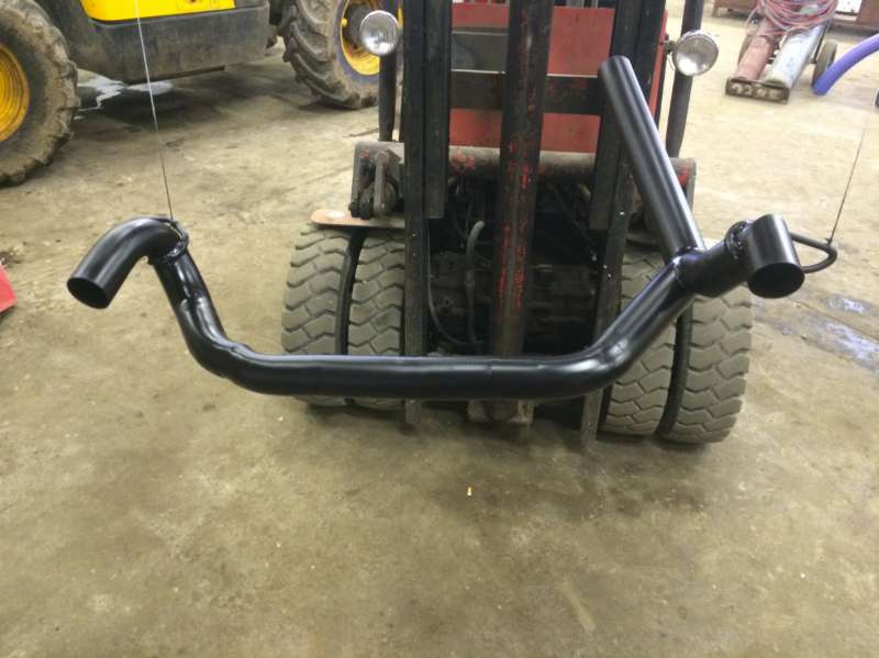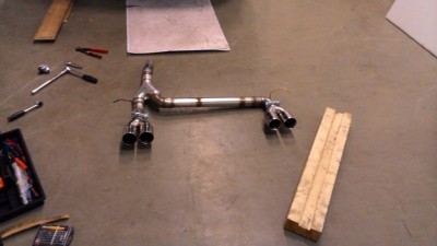 Použil jsem 4ks 90° kolen, 2m dlouhou trubku ⌀ 60mm, 50cm kulatinu ⌀ 10mm pro úchyty, 2ks koncovek ⌀ 90mm, výfukovou spojku, 2ks modrých powerflexů (musel jsem na jednom ořezat rohy a zúžit o cca milimetr aby se vešel do otvoru v nosníku) a 2ks 400ml černého spreje na výfuky.