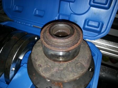 7- demontujeme matku z čepu spodního ramena pro otáčení kola a čep vypáčíme z těhlice, pak vykloníme těhlici směrem ven od motoru a vysuneme tisícihran poloosy. 8- teď použijeme přípravek pro demontáž ložiska, kdy se dvojitá objímka opře o těhlici, a šroub vytahuje ložisko za vnitřní kroužek ložiska. Mě to nešlo ani s dlouhou pákou, tak jsem předepnul šroub a pár ranami kladivem do šroubu stahováku jsem ložisko povolil. Pak už to šlo jako po másle. 9- vyčistíme těhlici od rzi pro montáž nového ložiska. 10- na nové ložisko dáme půlměsíce pro montáž ložiska za VNĚJŠÍ kroužek. 11- na nové ložisko a do těhlice naneseme pastu proti třecí korozi, já použil měděnou pastu.