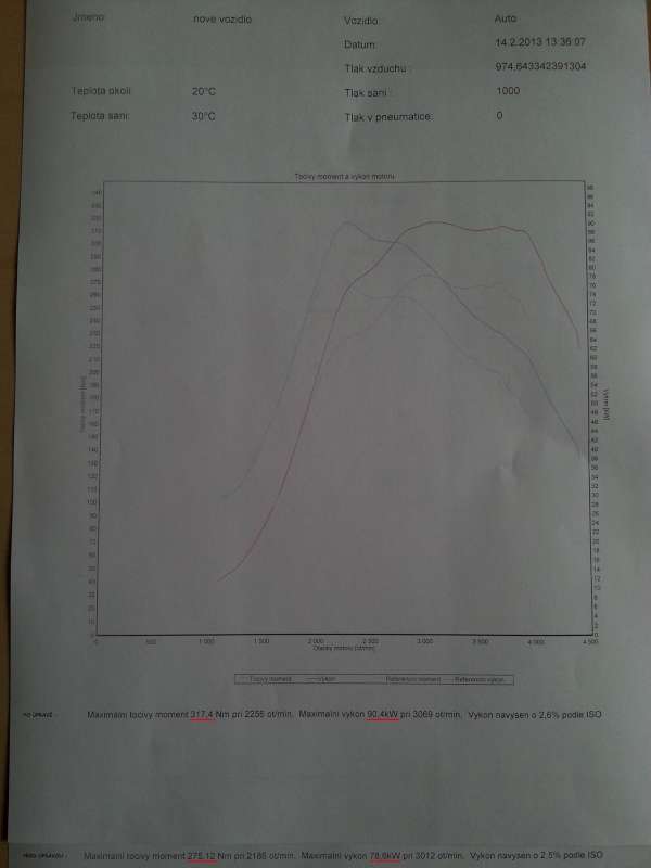 Ahoj, první momenty po optimalizaci na třetí nebo čtvrtý rychlostní stupeň byl pocit ze zátahu od nějakých 1900 ot. hodně znát. Postupem času jsem si ale na zvýšený výkon zvykl a už mi to ani nepřijde. Před navýšením naměřeno na brzdě 86kW a 329nm. Hodnoty výkonu zvednuty na 100kW a 360nm. Víc mi to nechtěl zvyšovat z důvodu vyššího kilometrového proběhu. Motor nekouří a emise na STK dopadla taky ok. Dovolená hodnota kouřivosti je 1,82, naměřená 1,6. Rozpětí hodnot kořivosti čtyř po sobě jdoucích zkoušek dovolená 0,25, naměřená 0,21. EGR ventil ponechán zaslepený.