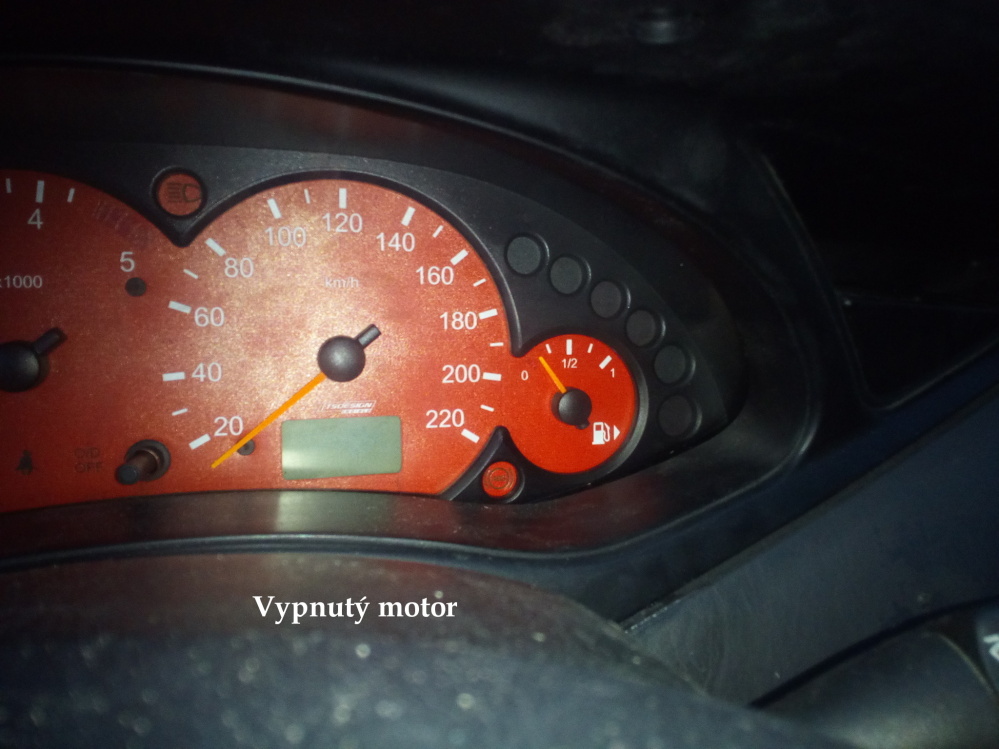 3.: Stav nádrže: Bez nastartování a klíčku v zapalování (tedy v čistě pouze otevřeném autě) neukazuje nádrž nulu (viz obr. č.2). Po otočení klíčem, případně po nastartování se ručička posune (viz obr. č.3)