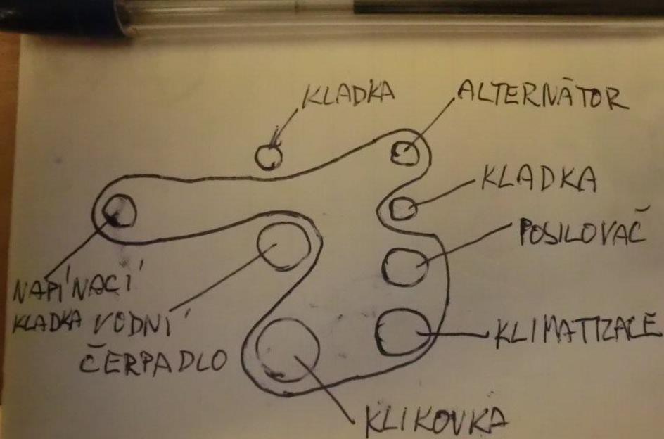 Chystal jsem se vyměnit drážkovaný řemen pohonu alternátoru, čerpadla posilovače, kompresoru klimatizace a vodního čerpadla. Objednal jsem řemen podle typu motoru, roku výroby a výbavy a teprve když jsem se chystal na výměnu jsem zjistil, že je u mně všechno jinak než ve všech popisech prodejců a na všech schématech, která jsem zatím kde našel.