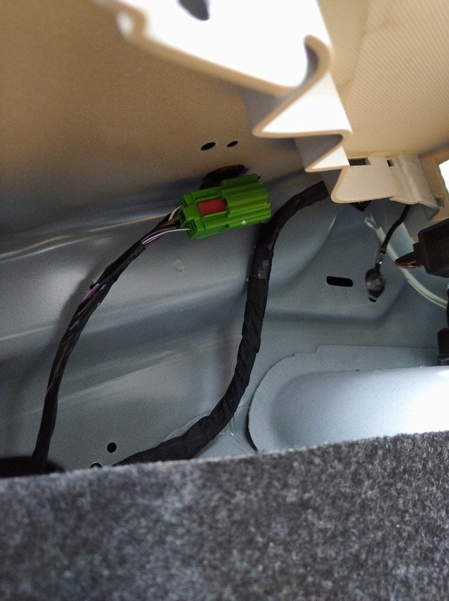 Pod stropnici se nachází konektory pro připojení nového svazku - jeden černý a jeden šedý. Nejlépe vždy postupně odpojit a hned připojit nový. Konektor po konektoru. Proste se vymění původní svazek za svazek nový. Nový kabelový svazek od původního má jeden konektor navíc. Jedná se právě o konektor pro připojení kamery – respektive připojení malého kabelového svazku pro kameru. Konektor má i předpřipravené svoje místo v konstrukci samotných pátých dveří.