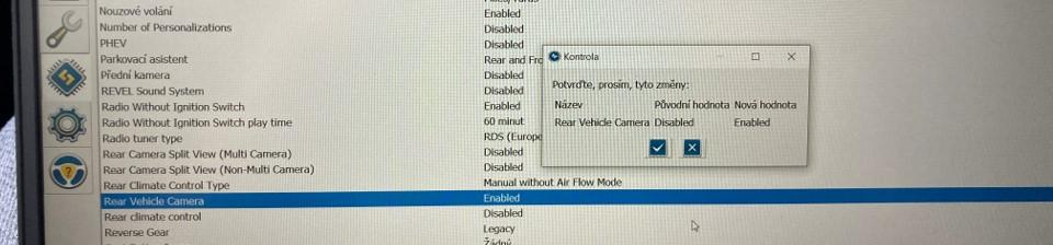 Ve FORScan v modulu APIM Konfigurace jednotky jsem upravil hodnotu Rear Vehicle Camera z Disabled na Enabled. Pote změnu uložíte a je hotovo. Po zařazeni zpátečky se aktivuje kamera a obraz je zobrazen na displeji.