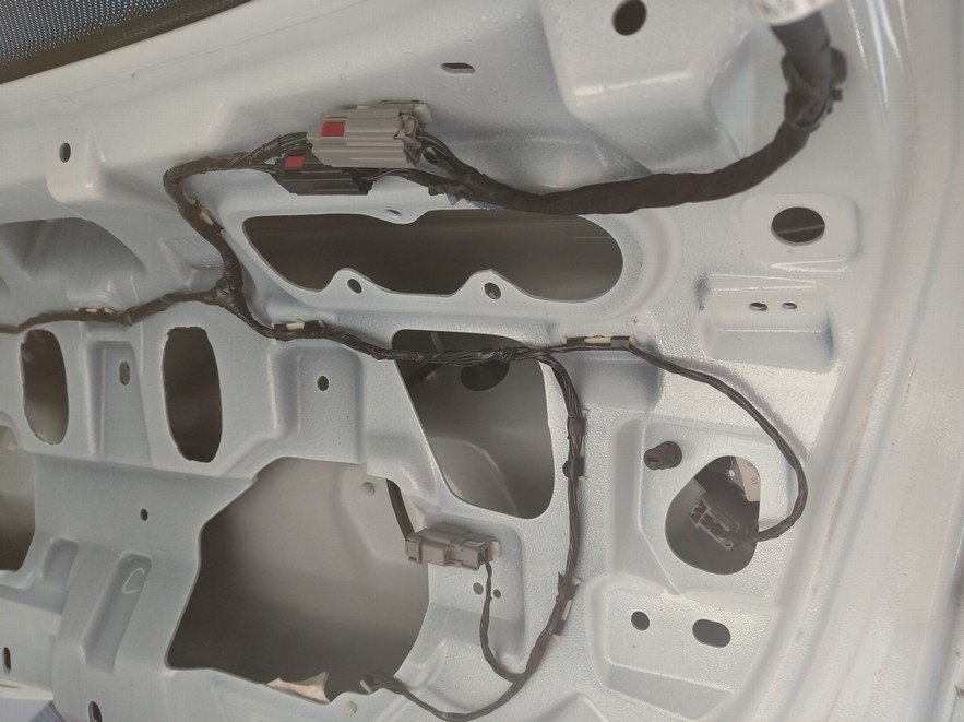 Pod stropnici se nachází konektory pro připojení nového svazku - jeden černý a jeden šedý. Nejlépe vždy postupně odpojit a hned připojit nový. Konektor po konektoru. Proste se vymění původní svazek za svazek nový. Nový kabelový svazek od původního má jeden konektor navíc. Jedná se právě o konektor pro připojení kamery – respektive připojení malého kabelového svazku pro kameru. Konektor má i předpřipravené svoje místo v konstrukci samotných pátých dveří.