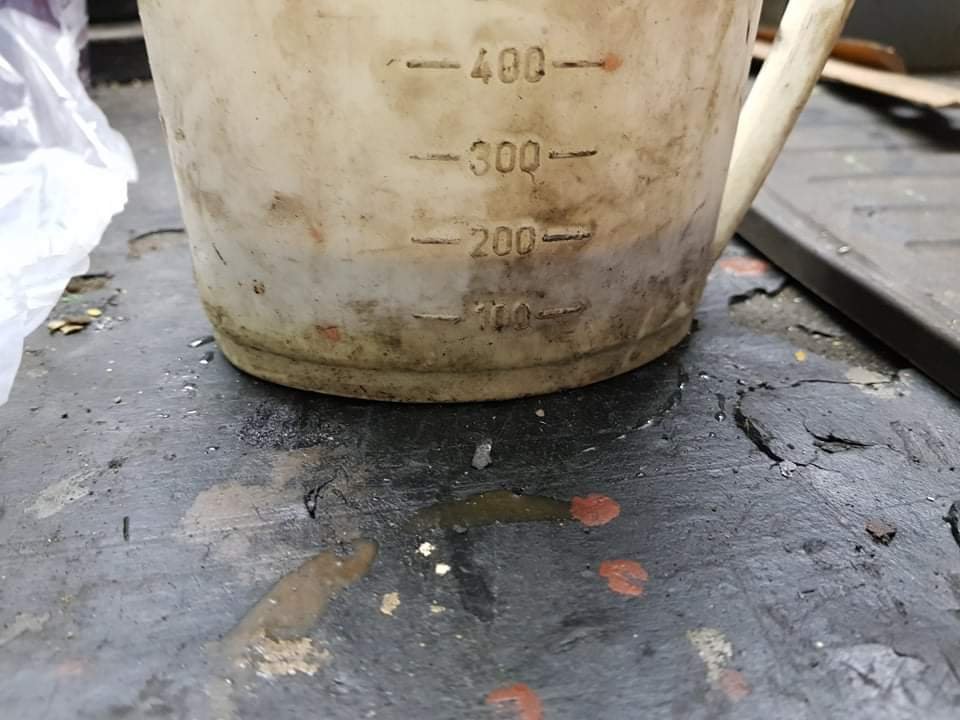 Nakonec jsem odsál něco kolem 125lm viz foto. Když jsem viděl tu hladinu pod klapkou tak jsem čekal i více ale určitě se mi to nepodařilo odsát vše. Takže za nějakých 75tis km tam mohlo být dejme tomu 150ml. Měl jsem zvedutý zádek na straně u splujezdce a ještě jsem to přizvedl i ve předu na stejné straně aby to co nejvíce steklo na sranu ke klapce.
