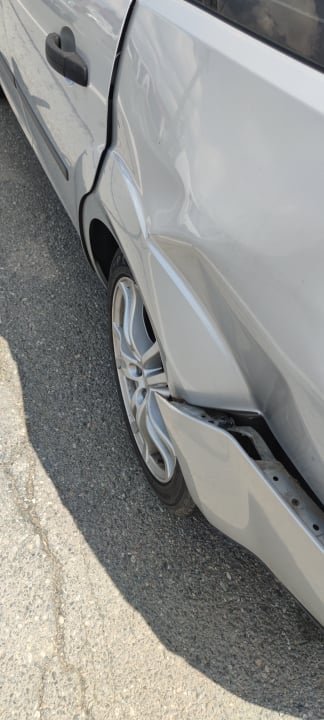 Přední levé světlo je KO, kapota dostala taky trošku, přední narázník je KO a dále nevím. Kvůli přednímu blatníku, který se nárazem posunul trošku dozadu se blbě otevírají a zavírají přední dveře u řidiče a zadní jsou na tom ještě hůř. Dveře od kufru KO, zadní nárazník KO a taky levý zadní blatník je KO a myslím, že se určitě nějakým způsobem hnulo i levé zadní kolo, protože je blíže blatníku než to kolo napravo, které je asi v pořádku.