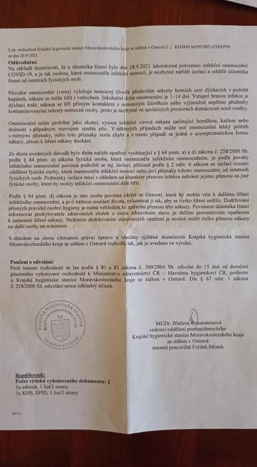 Kámošce (pozitivní v karanténě ) poslala hygiena pokyny, jak se má v karanténě chovat. Doporučeně a do vlastních rukou.![]()