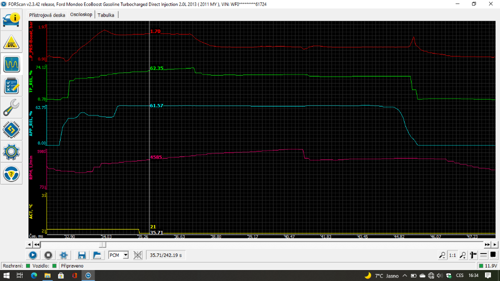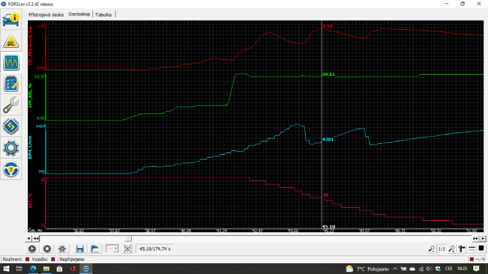 Načetl jsem teda live data a turbo tlačilo cca 0,8bar místo 1,2bar. A v řídící jednotce byla uložená chyba: Očividnou netěsnost jsem nenašel. Zkusil jsem pro jistotu vyměnit selenoid ovládání turba. Sice byl se starým turbem funkční, ale potřeboval jsem vyloučit chyby na autě, než dám repas turbo na reklamaci. No a po výměně už turbo tlačí. Ale když se dívám na průběh tlaku... Vždycky začne lehce klesat... Mám hledat někde malou netěsnost ve spoji hadic, sání,... Nebo je to normál?