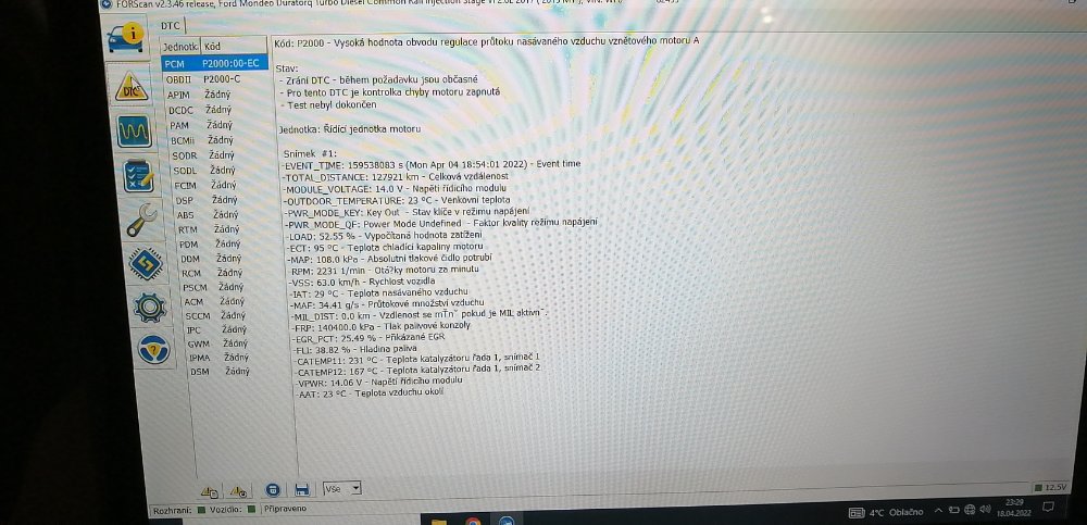 Vcera jsme dorazili domu a ihned jsem to napichnul na ForScan, chybu to vycetlo: