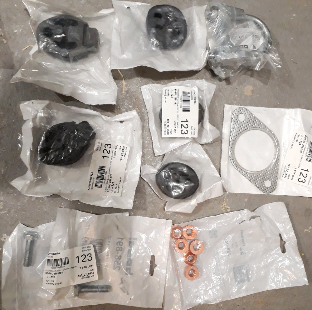 POZOR: Ty závěsné gumy u vlnovce jsou ve skutečnosti ty širší (tj. BS 255-017) a nikoliv ty užší (tj. BS 255-383), jak uvádějí různé katalogy autodílů. Podobně plánuji pak nastříkat ty matky a šrouby po nasazení nového výfuku.