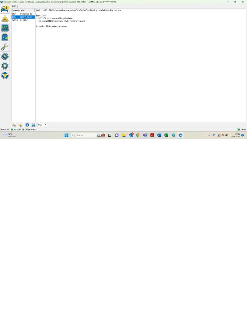 Tak jsem zprovoznil diagnostiku forscan, která se nechtěla připojit a našlo to chybu ještě U1035, ztráta komunikace se snímačem / spínačem hladiny chladící kapaliny motoru. Otázka, je vadná kabeláž, kterou přeměřoval technik, nebo ten válec co měří hladinu. Nemá náhodou někdo ten válec nebo kde sehnat za rozumné peníze, díky