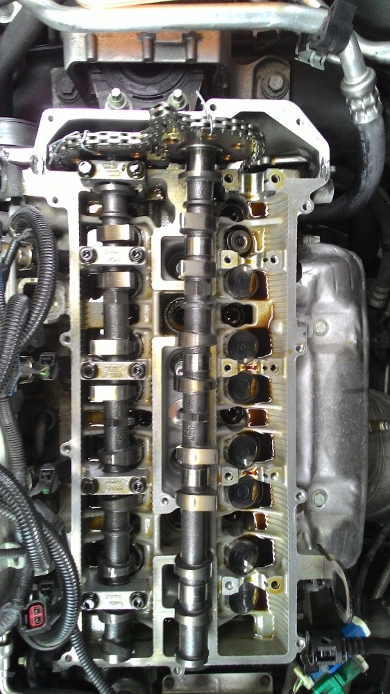 Když jsem koukal pod to ventilové víko, měl jsem pocit, že by to opravdu mohlo jít. Napadlo mě, že by se stahovací páskou zafixoval řetěz k ozubeným kolům vačkové hřídele skrz jejich otvory, potom by se mohla vačková hřídel posunout kousek stranou, (mimo svou podélnou osu) a šálky by tak šlo vyndat a změřit, aby se mohly objednat nové. Rozvody by se pak udělaly společně s výměnou šálků a auto by bylo mezitím pojízdné.