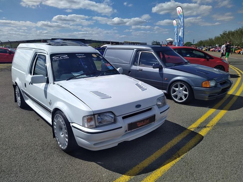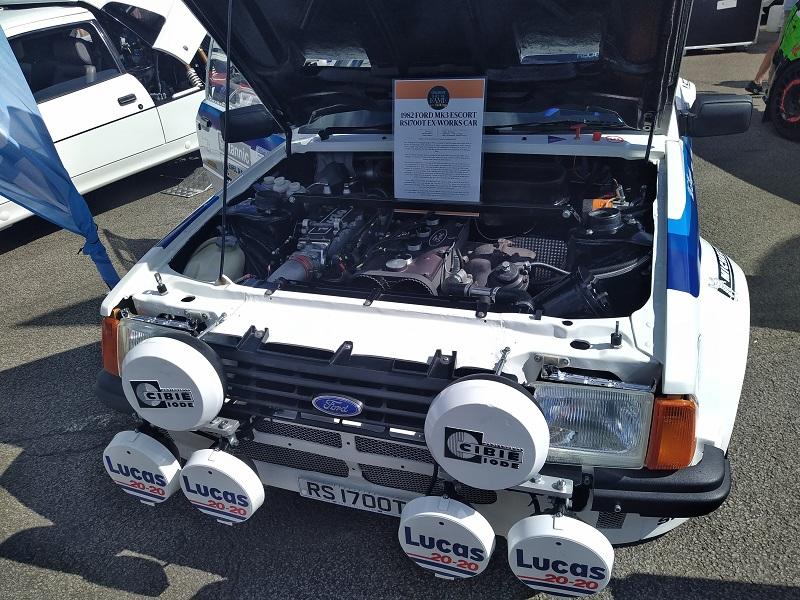 Už kousek od naší plochy, jsme viděli obrovské množství Fiest různých generací - je pravdou že ST180 je opravdu ve velkém počtu v anglii pořádně oblíbená a sekunduje jí její nástupkyně ST200. Samozřejmostí byly Focusy ST225 - také ve velkém počtu. Obecně, letos to byl ročník, kdy největší zastoupení co se počtu modelu týče, byla právě Fiesta. Procházíme kolem další tribuny a vystavované plochy. Hned z dálky do očí bijící - Escort RS Cosworth WRC tovární homologační speciál se "čtyřokem" na kapotě...Hned nám padla brada na začátek...o kus dál stojí první Ford Capri s krásným řadovým šestiválcem, vedle něj Cortiny poslední generace. Nevěděli jsme, kam dřív s očima - protože za auty byl plot a za ním dráha, takže chvíli jsme obdivovali stav a stáří aut a najednou hlavy nahoru a dívat se na ty zběsilosti na dráze...