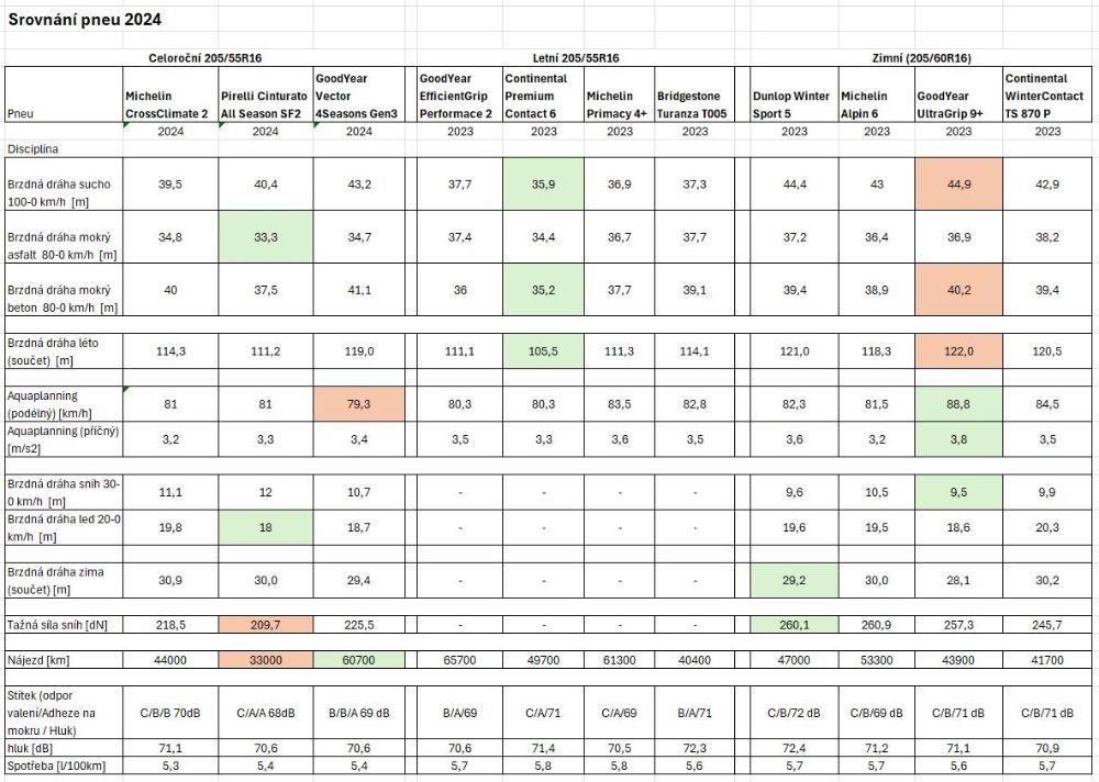 To je řekl bych základ pro slušný přehled, jaké jsou rozdíly nejenom mezi jednotlivými kategoriemi, ale i mezi jednotlivými pneu dané kategorie, které jsou hodnoceny ADACem nejlíp. Upozorňuji na to, že v rámci pneu dostupných na trhu jsou rozdíly samozřejmě daleko větší, nicméně cílem bylo zjistit, jak moc se (ne)liší.