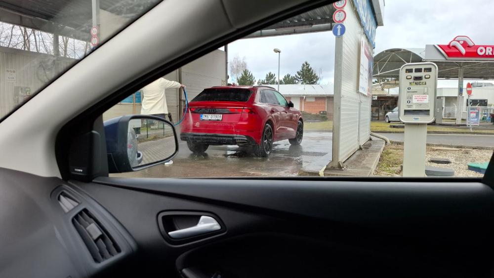 Adrenalinové mytí auta. Paní mi napřed vapkou spláchla levou nohu, když jsem si šel rozměnit peníze. Říkám si, proč se při puštěné vapce hrabe v kufru. A záhy jsem to pochopil. Ten kufr se jí během mytí nejmíň 10x otevřel. V kufru si nejspíš odvezla slušný rybník
