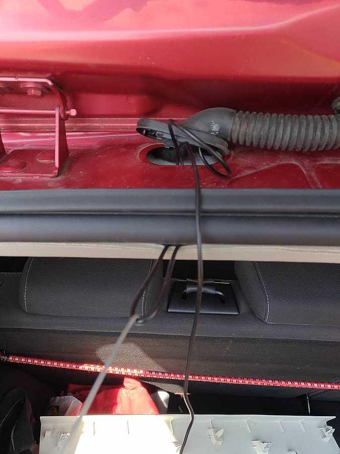 - já jsem při té příležitosti zjistil, že krajní konzole na liště jsou v horní části odlomené, tak jsem použil tmel na motory, který by mi jinak zaschnul: - protože dneska byl hic, podařilo se protáhnout konektory i spojka tou malou gumovou záslepkou (záslepka je velká, ale dírka malá), aniž bych ji roztrhnul. Nejdřívě šel větší (žlutý cinch), pak menší (červený napájecí) a nakonec spojka: - konektory jsem zaizoloval, aby se mi samovolně nerozpojily: - protože mi pájení moc nejde, používám takovéto spojky, které jen zatavím horkovzdušnou pistolí: - kostru jsem nikde netahal, protože páté dveře ukostřené jsou. Takže takto: - zvolil jsem levou stranu pro protažení kabelu (v zásadě je jedno, jestli zvolíš levou, nebo pravou stranu auta pro protažení) - pokud to šlo, nevycvakával jsem plasty za každou cenu, takže zde jsem stropnici jen poodhrnul a pomohl si háčkem - povolil jsem dva šrouby na levé straně kufru platu u světla interiéru a malinkato povycvaknul. Pak šel kabel prostrčit. - z LZ místa spolujezdce jsem prostrčil vázací drát s očkem kolem světýlka a protáhnul kabel do kabiny