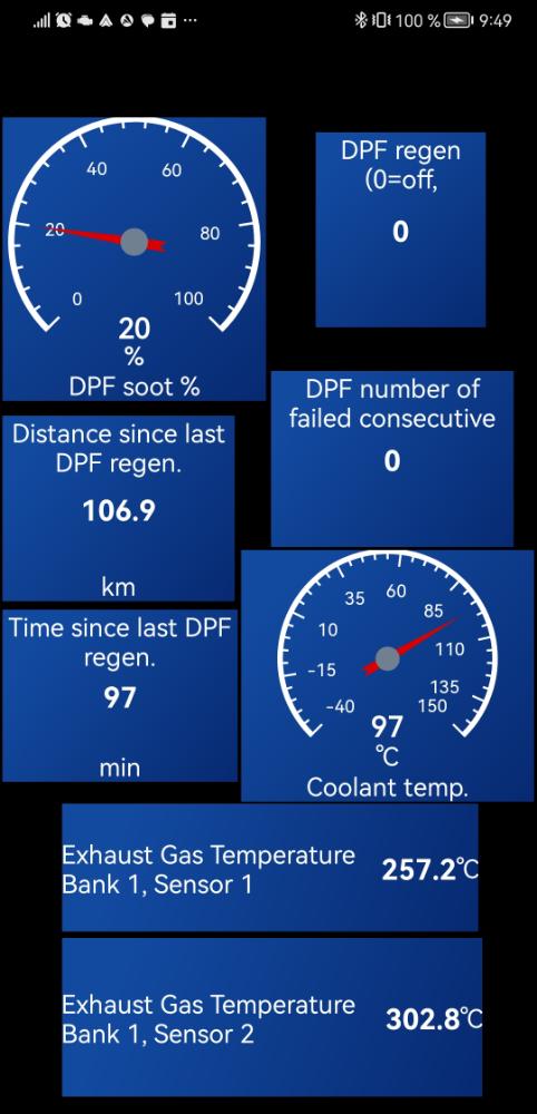 teď už to nesouvisí s přístrojovou deskou, ale pro zobrazení zaplnění sazemi DPF Soot Concentration (%) , Exhaust Gas Temperature # 2 , Particular Filter (DPF) regeneration in progress, Distance since last DPF regen a ...jsem si pořídil vLinker FD+ do OBD2 v autě a aplikaci Car scanner na mobil. Po spárování přes bluetooth pak můžete v mobilní aplikaci přidat senzory jaké chcete (plná verze PRO je za 150 Kč na stálo), mě zajímalo jen DPF (je tam toho mraky). Ještě vše musím testovat a lépe se s aplikací naučit, ale zobrazuje mi to, co potřebuji. Dnes jsem vyzkoušel a připojil k autu.