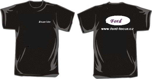 No moje představa těch triček je..bud černý nebo fordácky modrý..a bíle natištěný...zepředu na levym prsu by byl nick name..a zezadu přes ramena by byl znak fordu...ford-focus .cz..znak fordu a pod tím bych vymyslel nějakej znak pro nás česko lipáky..co vy na to?