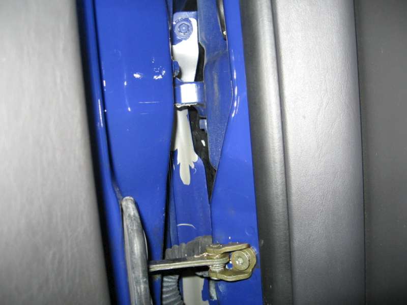 Auto melo v popisu maly prohyb u zadnich dveri. Nemohl jsem pochopit, od ceho to muze byt a prodejce mi to taky nedokazal rict. Za chvili jsem nasel sedrenej lak u okynka zadnich dveri (viz obr.), taky nevedel, asi od klicu... U pantu prednich dveri zevnitr byl lak seskrabanej uplne ... Ale vsechny dvere doviraly stejne dobre a skla mely stejny znaky. Prahy a sloupek vypadaly nedotcene.