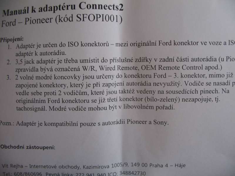 Přesný typ toho adaptéru neznám. V nabídce byl jediný, jiné shopy toho o moc více také nenabízely, tak jsem vzal, co bylo. Možná ti pomůže ten štítek.Stela píše:napiš prosimtě přesně typ toho adapteru pro pionyra na orygo ovladaní pod volant a pokud mužeš tak to vyfot při montaži dík