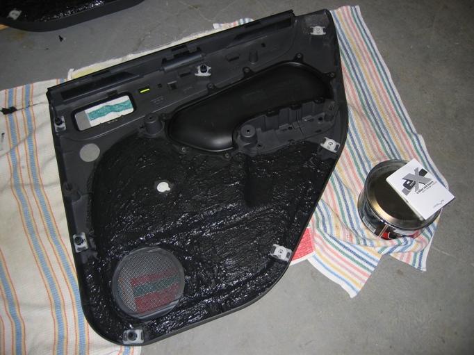 Zatím se mi podařilo zvládnout vytlumit vnější plechy na obou dveřích materiálem Vibraflex. Taky jsem si připravil tapec na instalaci výškových repro a trochu jsem ho vypatlal pastou Brax.