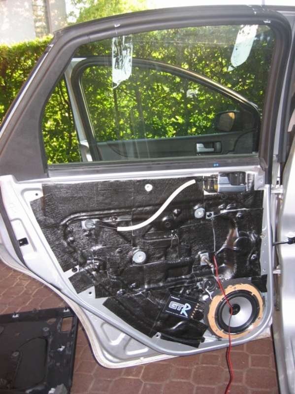 Zatím se mi podařilo zvládnout vytlumit vnější plechy na obou dveřích materiálem Vibraflex. Taky jsem si připravil tapec na instalaci výškových repro a trochu jsem ho vypatlal pastou Brax.