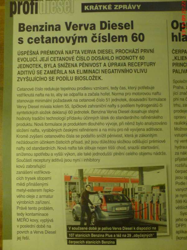 Ještě jedna věc a to vaše 1,6 s Fapem ,kde se uvádí ,že je doporučeno tankovat palivo s normou pro Euro IV což prolezla jen Benzina prokazatelně zvyšuje cetanové číslo které je velmi účinné pro kvalitní spalování a nižší tvorbu kouře .Cetanové číslo spůsobí že nafta začne hořet dříve zejména při vysokých otáčkách a vysokém zatížení a právě u aut s fap to znamená pomalejší zanášení toho bazmektovýho filtru menší počet regenerací a tím pádem vyšší životnost olejové náplně a filtru.Hodně se to může projevit u aut co mají proměnný servisní interval řízený počítačem .Moderní nafta tak může vrátit motoristovi svojí vyšší cenu snížením rizika závad ,ale i servisních nákladů zdroj Autodiesl