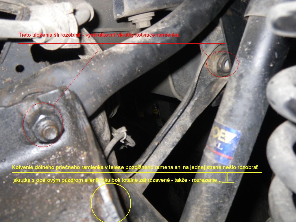 No úplne všetky nie - nemenil som tie čo sú v tom spodnom priečnom ramene (Ľ+P) - jeden /silentblok/ je kotvenie v pozdĺžnom ramene vzadu a druhý bod/silentblok/ je v uložení nápravnice s excentrom - skrutkou s excentrickou hlavou, ktorej natáčaním sa nastavuje zbiehavosť zadných kolies. Oba nemenené silentbloky sú zalisované v tom priečnom spodnom ramene zadnej nápravy v ktorom je i spodná miska pružiny.