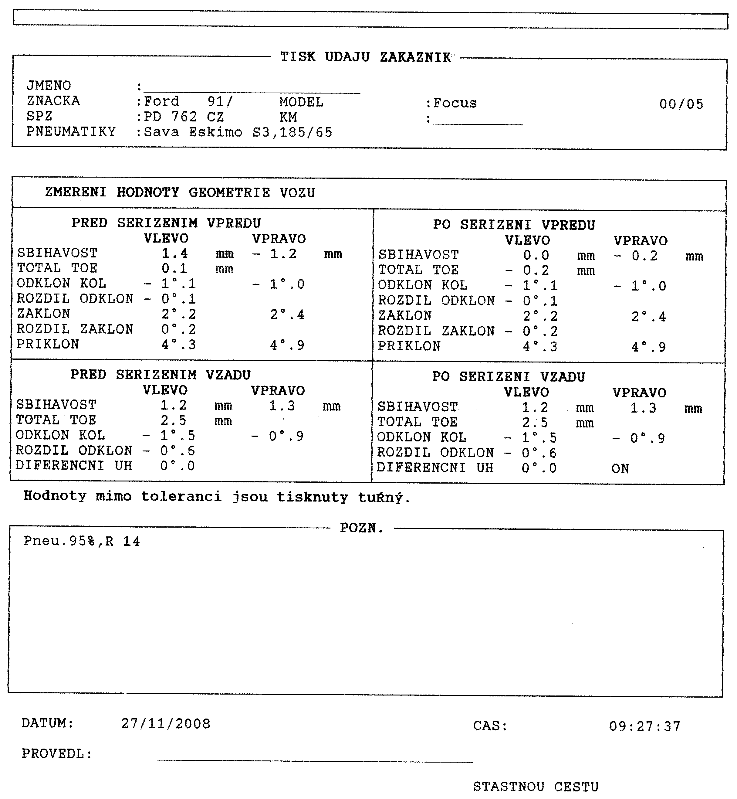 Tam kde som bol teraz ja už tiež nepôjdem - musel som ich upozorňovať na chyby v postupe meraní - merajú sa max. uhly - Ľ a potom P a potom sa aretuje volant v stredovej polohe a nastavujú sa jednotlivé kolesá....Občan nastavil uhly a mal zle zaaretovaný volant - takže zle...protokol po nastavení hovorím - ešte raz - tak som tam bol vyše hodiny a po týždni som i tak prišiel späť - volant bol ešte stále o cca 1-2°doľava pri jazde priamo....takže ďalšia hodina a nesedeli mu záklony...čo sa nemenia - a tak som čakal na majiteľa a ten prišiel nahodil ešte raz a nameralo dobre a aj auto je ako má byť - ale tie peripetie....tam už ma neuvidia - ani ich neodporúčam, aj keď majú 3D!