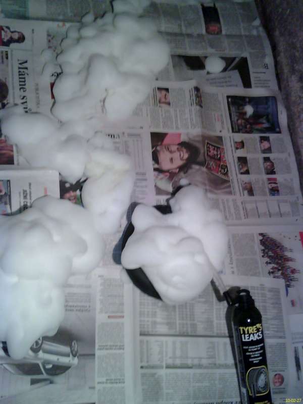 Dneska jsem vyzkoušel jeden takový opravný sprej. Píchlá duše v kolečku od vozíku a byl jsem líný lepit flek, řekl jsem si že prubnu ten opravný sprej.