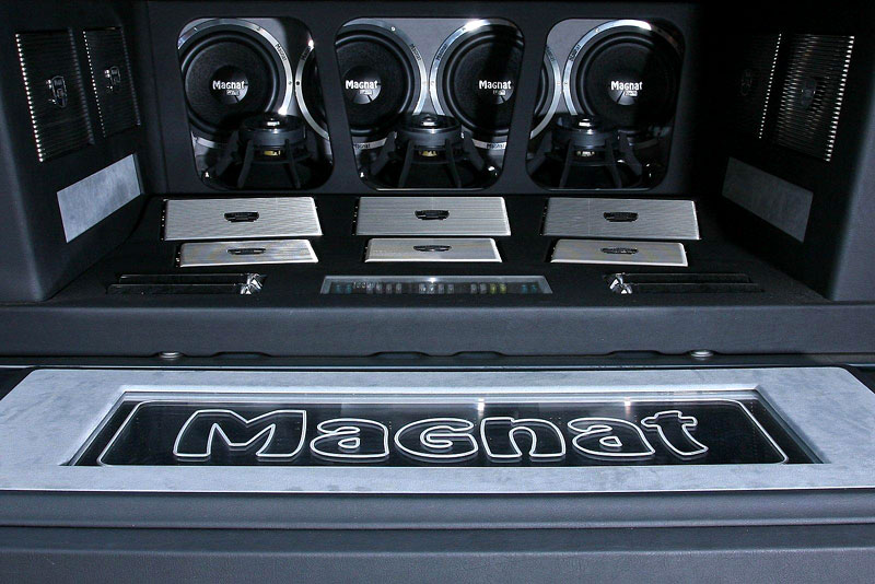Na palubě našlo své místo celkem 17 reproduktorů a deset zesilovačů, auto je dále vybaveno přehrávači DVD (a samozřejmě velkými LCD obrazovkami), v zácpě se můžete dívat na TV nebo hrát nějakou gamesu na Xboxu 360. To vše pěkně ze sportovních Recar, která vaše tělo podrží i v ostrých zatáčkách – i ty totiž F150 bude schopen projíždět solidním tempem díky upravenému podvozku a lehce potuněnému motoru (výkon agregátu 5.4 V8 poskočil na 250 kW). Bublat vám k tomu bude sportovní výfuk od Wimmera a pískat Yokohamy o rozměru 305/40 R22 – no řekněte, nebude to pak na palubě opravdový koncert i bez audiosoustavy?