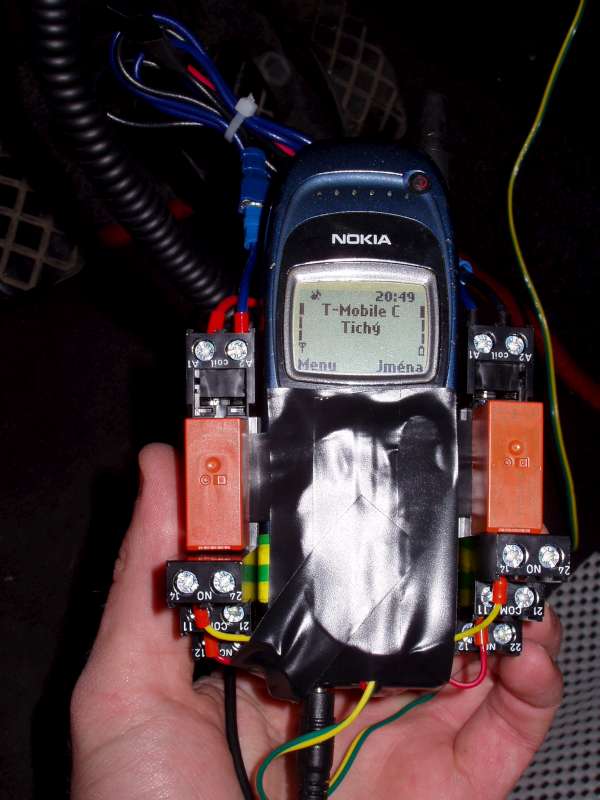. Vypínací tlačítko telefonu je vyvedeno externě. V telefonu SIM s aktivovanou lokalizací polohy přes GSM - moc přesné to není, ale alespoň něco. Ještě se mi tu váli jedno HF, takže to tentokrát chci udělat i s natažením mikrofonu do interiéru.