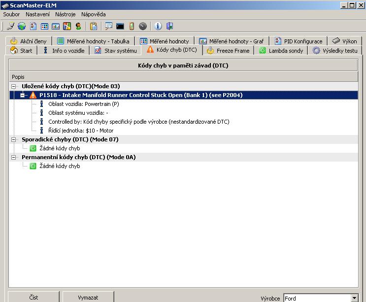 sviti kontrolka motoru a pise chybu P1518