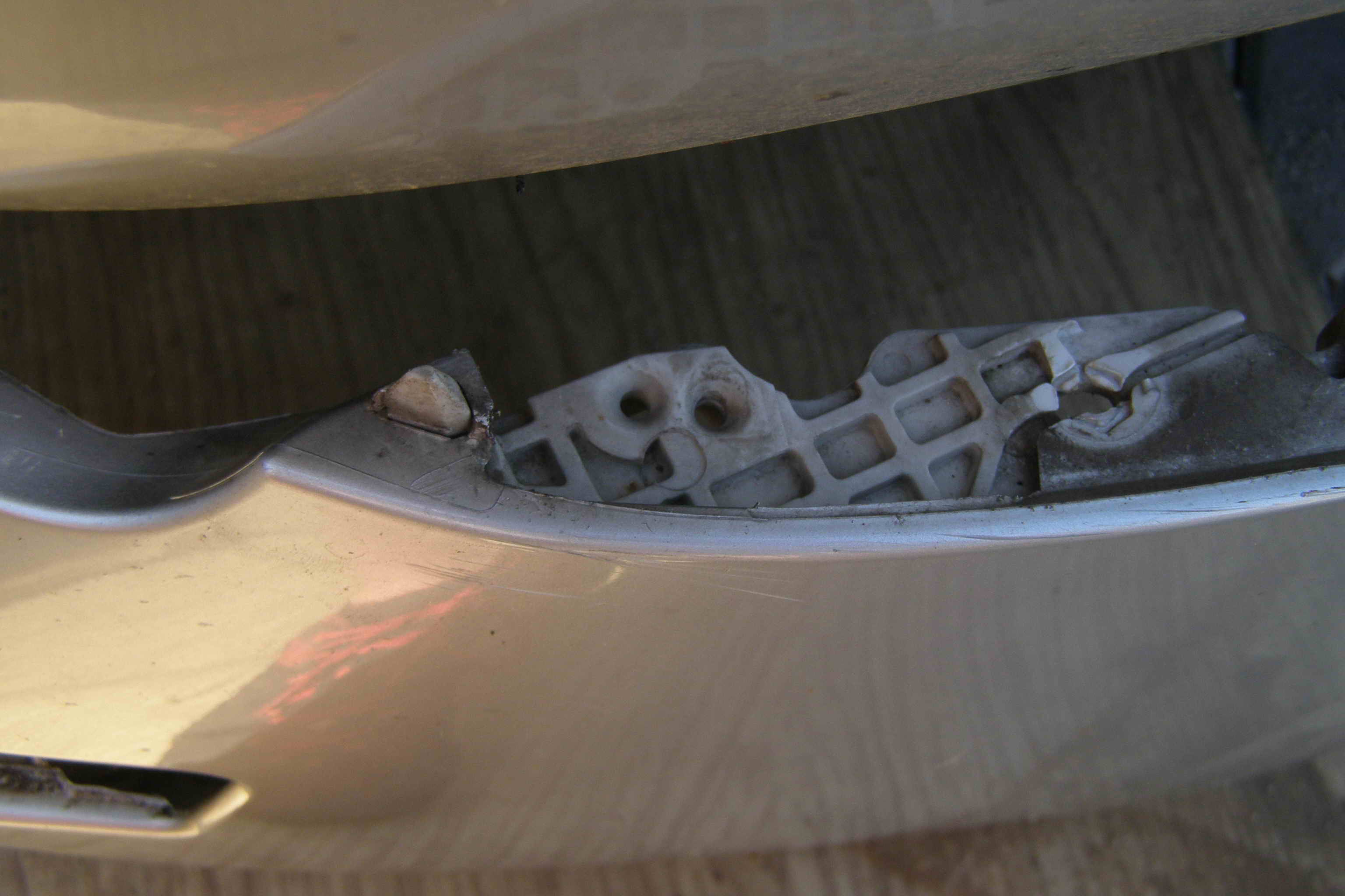 Podle mě ti tam chybí šrou a nebo je tam nastřelená taková tyčka a ta je nacvaklá v kousku plastu v nárazníku. Měl jsem docela problém to z toho vycvaknout. Tak pod to vlez a koukni se.