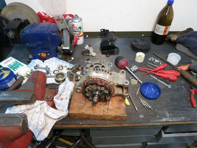 Tyjo, moc si to nepamatuju, už to dlouho zase funguje. Prostě jsem si sehnal tu hvězdičku, odpojil jsem baterku a povoloval, co bylo třeba. Původně jsem ta ložiska chtěl jen přimáznout, ale nakonec jsem to odnesl rozebrané autoelektrikářům, aby to přelisovali a přebrousili kroužky. Doma jsem si to pak dokompletoval a zalepil silikonem. Mám koupenou i sadu řemenů, ze které jsem nakonec použil jen ten přípravek na nasazení. Přeci jen je pohodlnější to všechno přidělat a řemen na vodní pumpu natáhnout až nakonec...