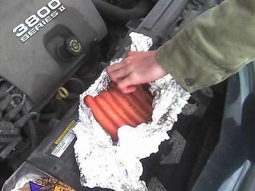 Otevřu kapotu a vytáhnu v alobalu krásně uvařené párečky