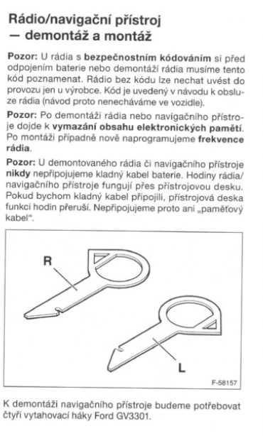 randycz: snad Ti to pomůže. Vydličky musí mít Ford (pokud máš možnost, zkus zajet jinam). V návodu píšou, že musí být GV3301 - nevím zda-li jsou stejné jako na normální rádia - kód nevím.