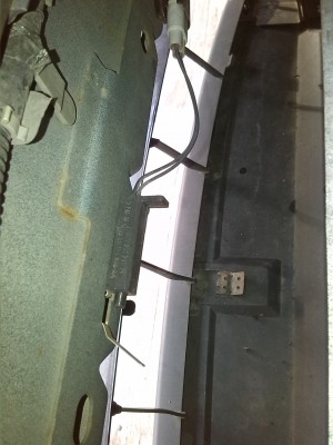 Kabel k čidlu pro vnější teplotu je asi 3 m dlouhý. Pro protažení kabelu čidla jsem použil "Kóťovu cestu" (obr. o pár příspěvků výše) a nechtělo se mi to tahat až dopředu, tak jsem zkusil náhradní umístění čidla: Sice nevím proč, čidlo měřilo o 4-5ºC více. Proto jsem zkusil využít celé délky kabelu a vyšlo to až před přední podběh a je prostrčené otvorem za levým světlometem dolů a přilepené zevnitř na nárazníku kousek nad tou spodní lištou nárazníku. Pokud i tohle umístění zklame, pak to protáhnu až na příčku nárazníku jako je origo čidlo.