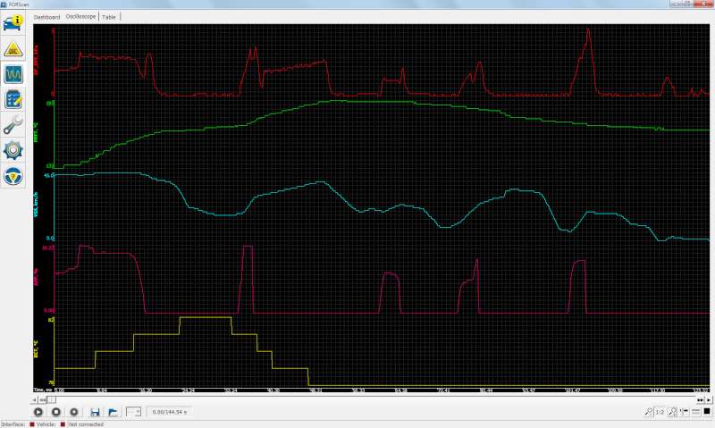 Slíbené grafy s diferenčním tlakem DPF (edit: mám 66kW verzi). Kdo má ForScan, bude vědět, co je co. Některé zřejmé závislosti vypadají hezky.