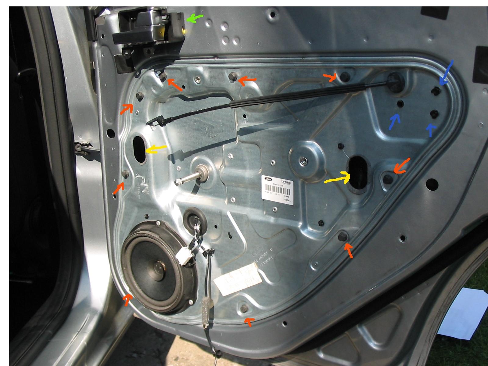 Vycvaknout umělé „válečky“ – modré (já je prorazil dovnitř), odšroubovat šroubky (oranž) a teď odlepit díry zakrývající šrouby (žluté), které drží mechanismu posunující okno a vycvakat kabeláž (vnitřkem vede centrál), kabel od výškového repra – byl jsem zvědavý jestli je to opravdu „předpříprava“ pro výškáč a připojil k tomu reprák, výsledek? HRAJE! Takže je možné relativně snadné „upgradování“ muziky v zadní části vozu, lepší než nic