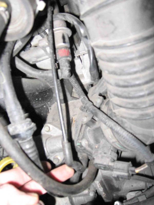 barevný šlauch vede z reduktoru (snad se to tak jmenuje) a vede dolu někam do vzduchového potrubí viz. foto detail - je to ta hadice pod prstem