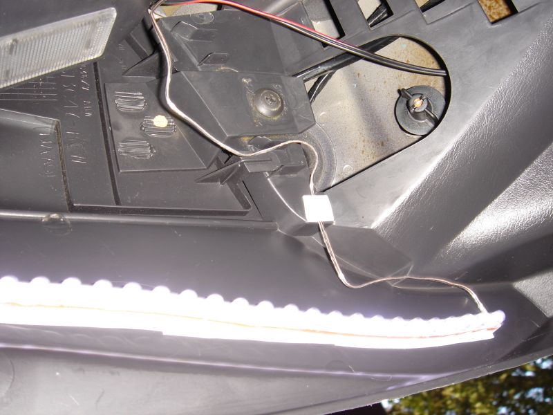 postup v skratke: vybral som priesvitne tienidlo z osvetlenia, objimku so ziarovkou som natvrdo odstrihol (nie je nutne, ale ja som neplanoval pouzivat dalej, uz nie je treba :o) na kabliky som nasadil cokoladku a pripojil na kable z lavej LED a predlzovaci kabel na pravu LED (kedze original kablik nedociahol). odskrutkoval som plastove oblozenie: vertiklane cierne vpravo aj vlavo a takisto horizontalne na hrane kufra. potiahol som kable tak, aby isli skryte v karoserii pod hranou kufra. tam som spravil napojenie predlzovacieho kabla na pravu LED, takisto cokoladku a kedze je to "rizikova oblast" radsej som ju obalil izolacnou paskou. led pasiky som prilepil obosjtrannou paskou na podhlad dekoracnych plastov. hotovo. celkom to trvalo max. nejaku polhodku.