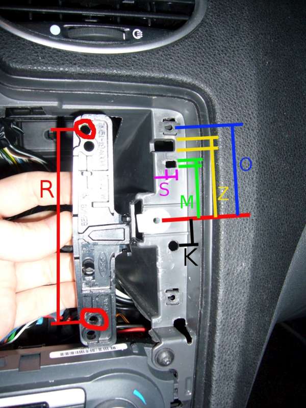 Když máš hranatý rádio (který se vyndává těma spešl klíčema) a chceš namontovat oválný (je přidělaný jen 4 kříž. šroubama), potřebuješ jen jeden nový rámeček kolem rádia a klimy (je to v jednom kuse) a jeden pár těch "redukčních" pacek (do nich jdou pak ty šrouby, na obrázku jsou červeně označený) :wink: