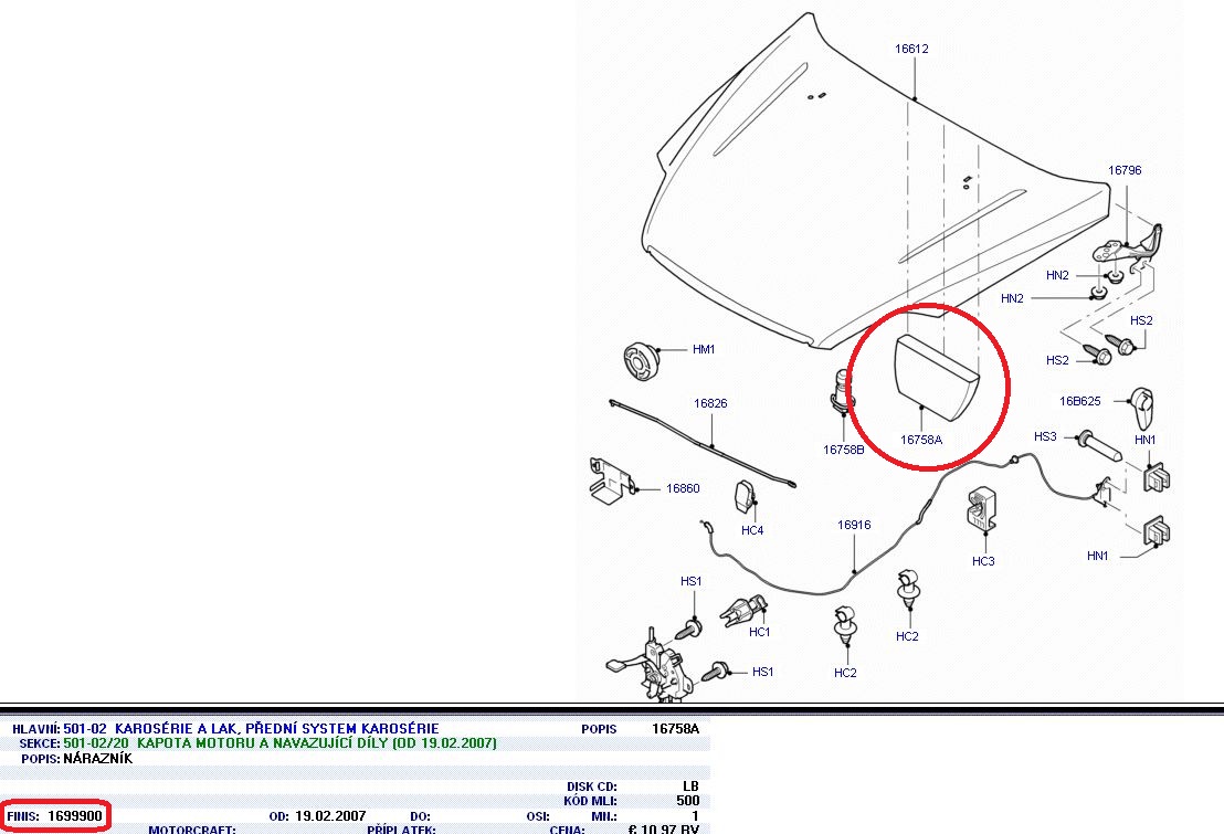 V červeným kroužku na obrázku je ta pružina, co vrací páčku, se kterou hýbe lanko. Na druhým konci (dole) té páčky je uchyceno lanko. Této páčce je třeba pomoct doprava, když zůstane viset zámek a nejde zacvaknout kapota!