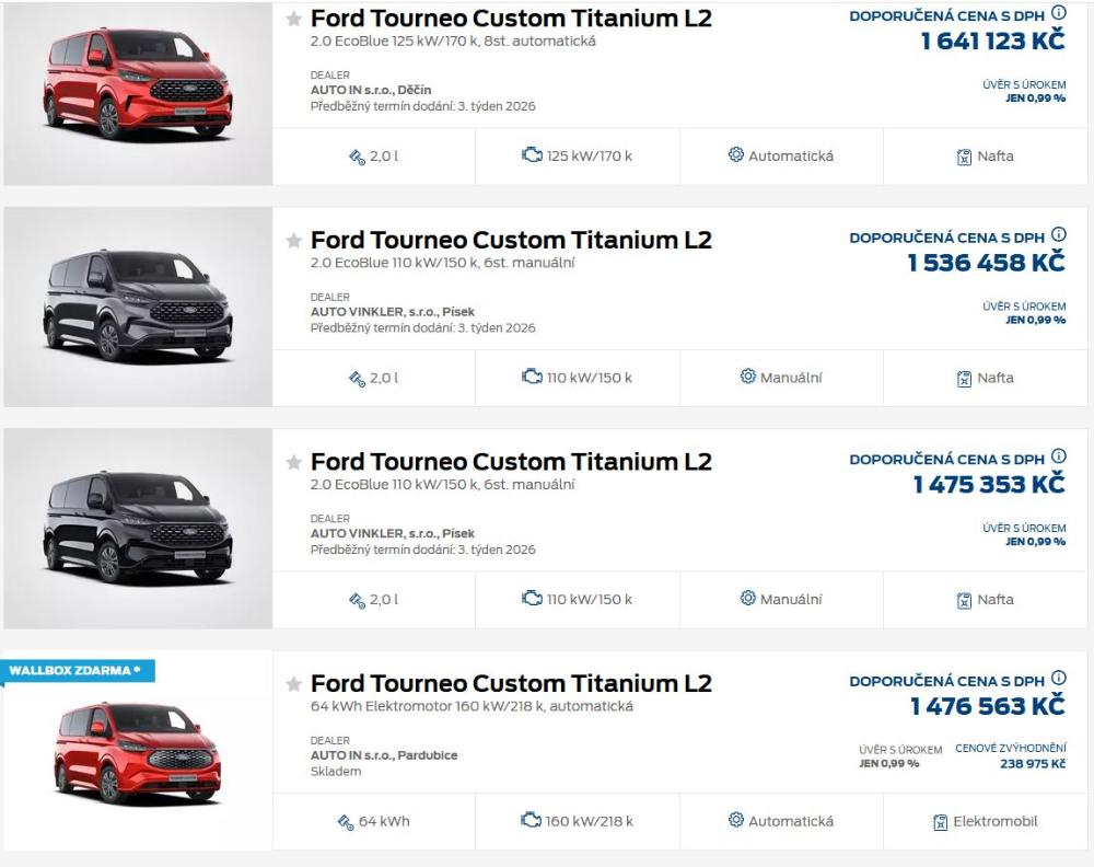 Pomáhal jsem teď kolegovi s konfigurací a objednávkou Tournea. Od prodejce jsem se dozvěděl, že letos už žádné fosilní Tourneo nejde přihlásit (flotilové emise) a i kdyby to auto do konce roku vyrobili, budu čekat až na rok 2026. Jsou moc rádi, tak jako zákazníci. Na opravdu, když se kouknete na Ford skladem, tak všechna auta, krom e-Tournea, dodání 3. týden 2026.