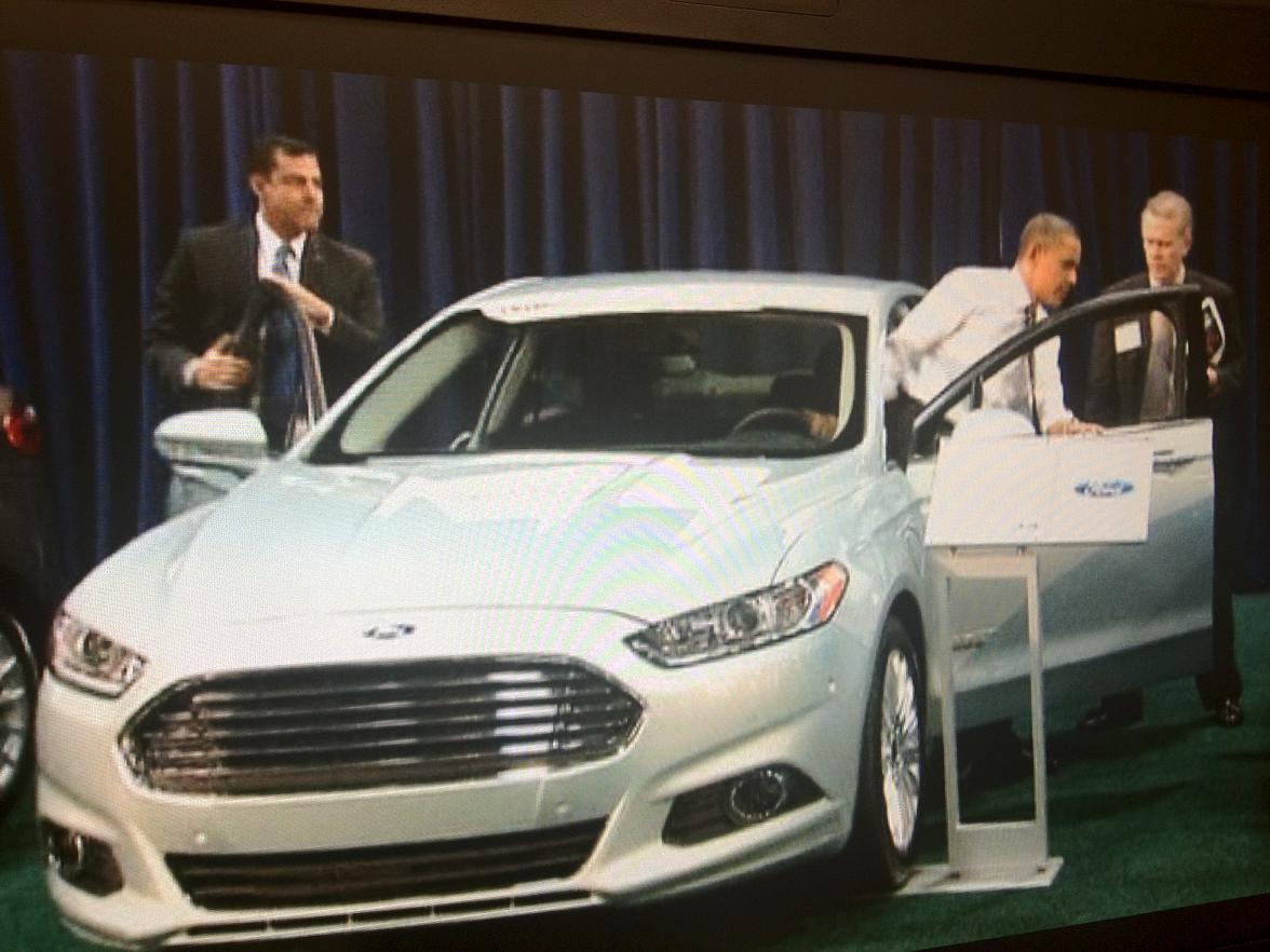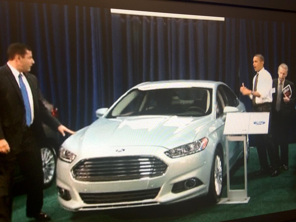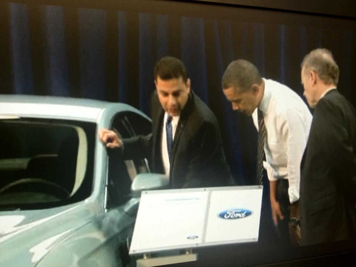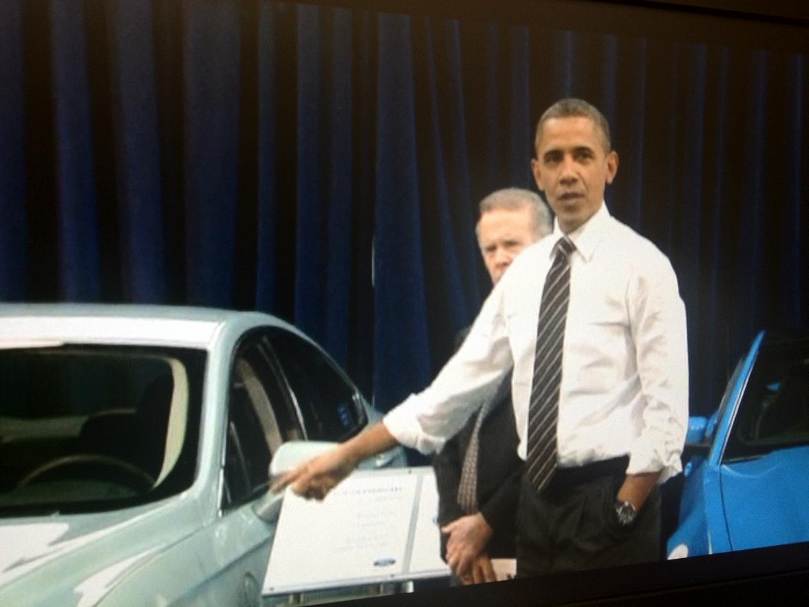 (Je to speciální pozvánka pro něho do Fordu, všude kolem v řade jsou všechny typy vozů Ford)