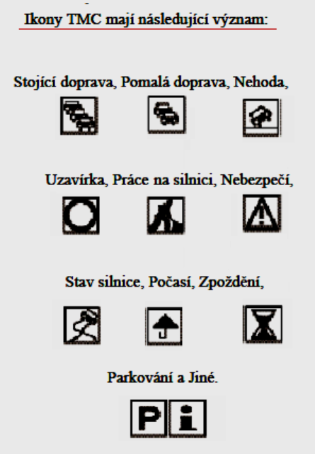 ivoch, myslim ze v navode je zoznam medzinarodnych ikon pre TMC, alebo sa to da najst aj na nejakej stranke ktoru som tu niekde daval. a to co sa zobrazi zalezi od "obsluhy" toho systemu ktory vysiela informacie. a aj od pokrytia lokalizacnymu tabulkami (ale dalnice su dobre pokryte)