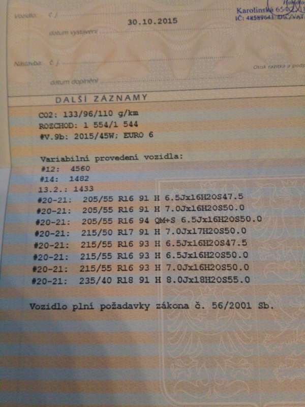 Nicméně pro zimní můžeš použít jakýkoliv z povolených rozměrů pneu a index libovolný. Jen je třeba mít tu nálepku/varování v palubáku, pokud je index nižší než předepsaný... Mám zimní pneu s indexem H (215/55/16), tzn. nižší, nálepku nemám a zatím problém nebyl, ani na STK. Za stejný rozměr s indexem V bych dal skoro o litr na pneu víc. Nevím, jaký index má 1.0EB, ale index H se dá sehnat celkem levně, index T (190kmh) ještě lépe.