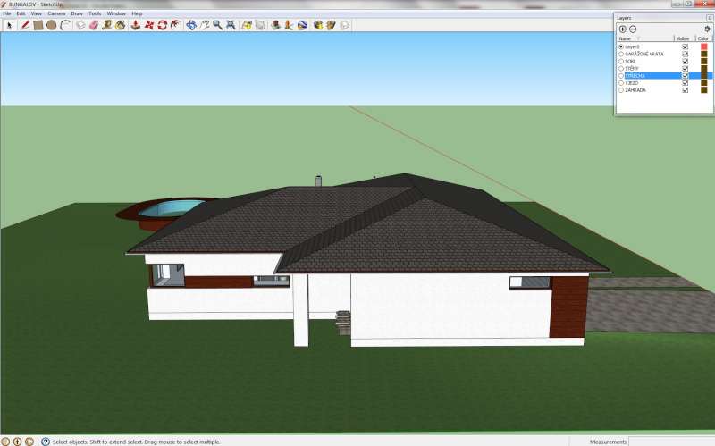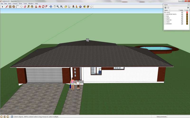 Dal jsem na Vas a komin uz neni v detskem pokoji. Uprostred vznikla technicka mistnost a pradelna zaroven. Druhy detsky pokoj vznikl misto puvodni pradelny. Domek se jeste o kousek zvetsil a rovnou strechu jsem vymenil za valbovou (tim vznikl i fajn koutek na drevo). Zahrada je zatim provizorni - pouze trava a bazen jeste neni umisteny
