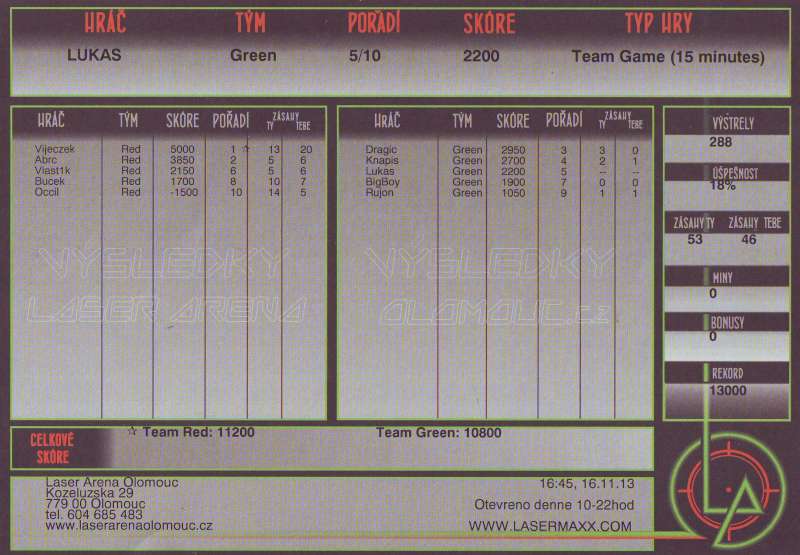 No to je dost, že aspoň někdo přidal svůj výsledek z laserové bitvy